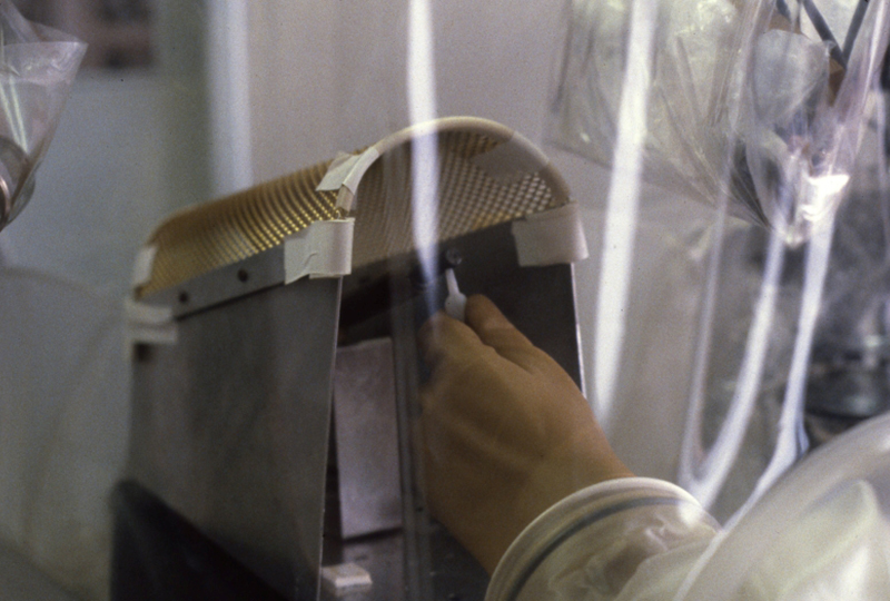 Working in a laminar flow cabinet, a partly open work space in which the air flows such that no dust particles, viruses or bacteria settle on the samples. At the same time the risks to the worker or researcher are limited. Maximum security laboratory, Antwerp, 1977.