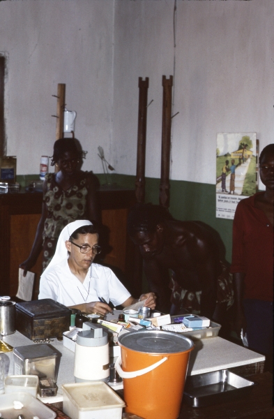 Sisters Genoveva (left) and Marcella of the Holy Heart of Maria of 's-Gravenwezel keep up people’s courage. Sister Geno is – among many other things - the 'announcer' of Guido's TV station. Sister Marcella is the nun who noted all epidemiological information before the commission members arrived in Yambuku, Zaïre 1976.