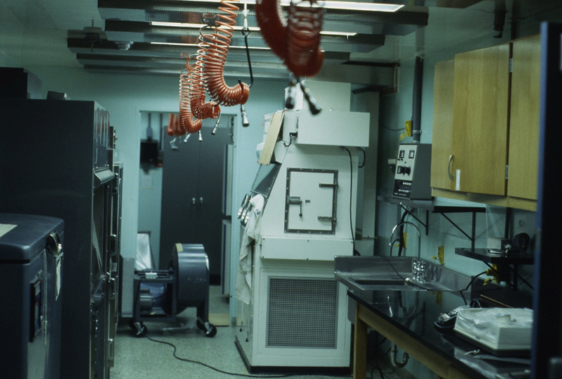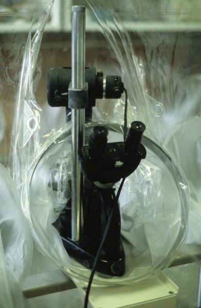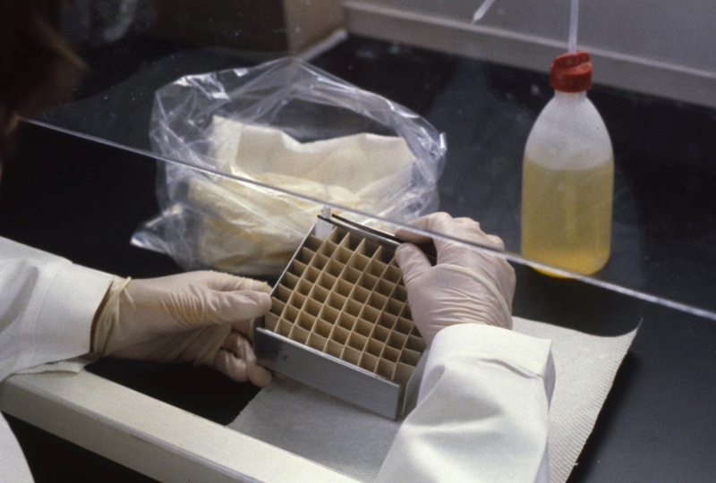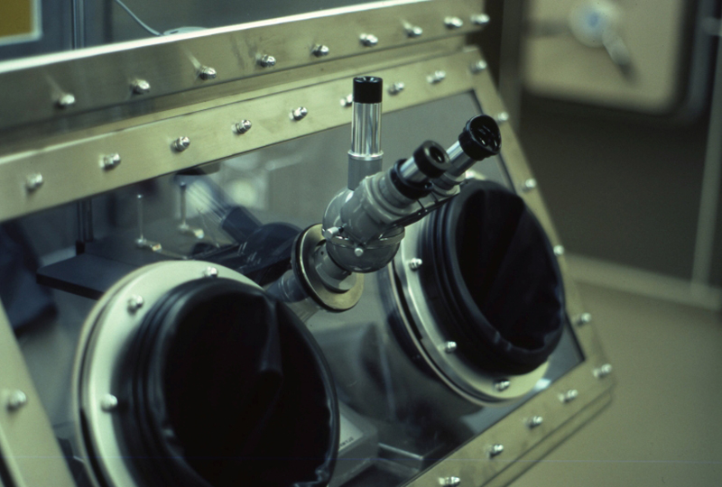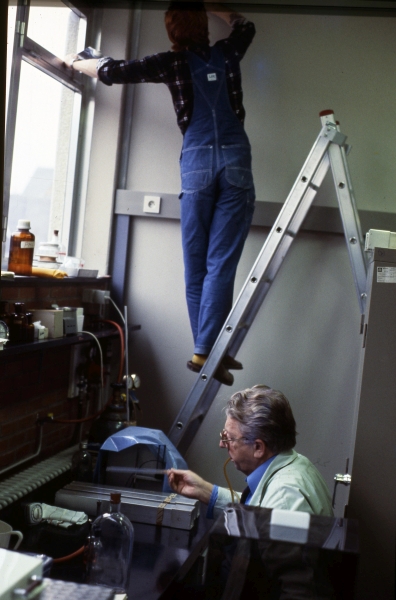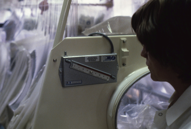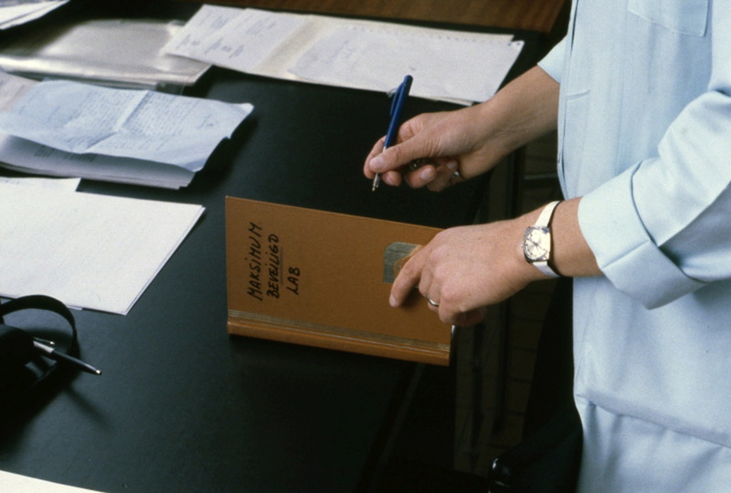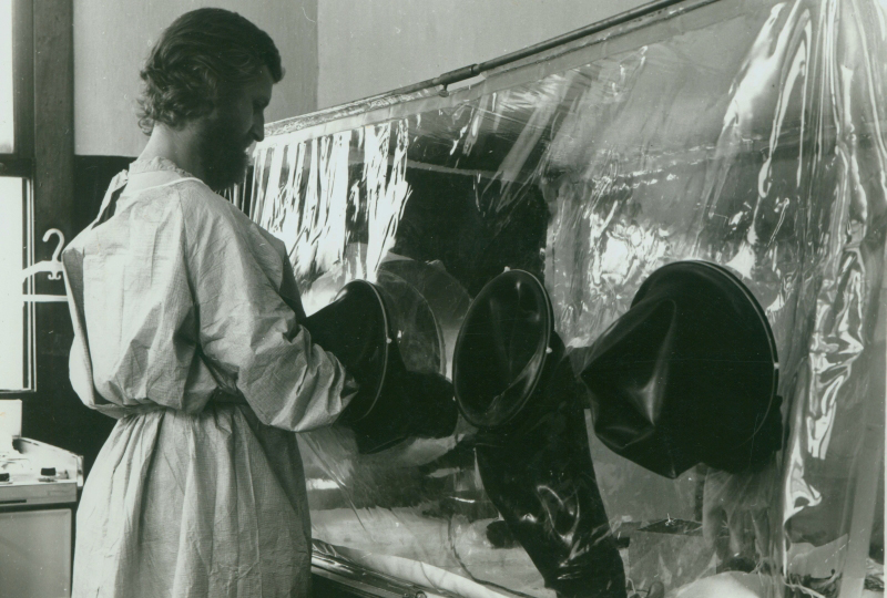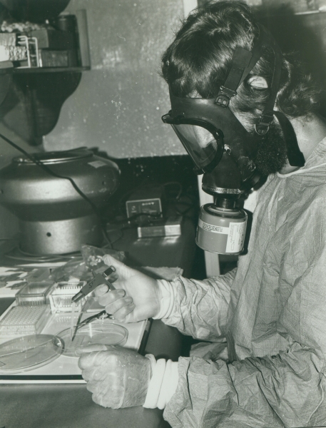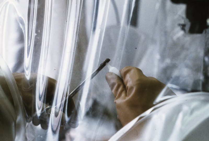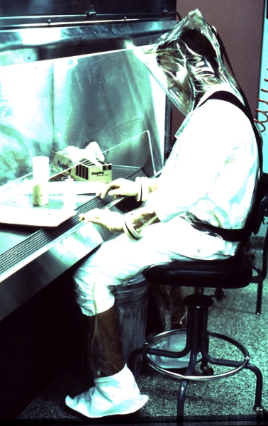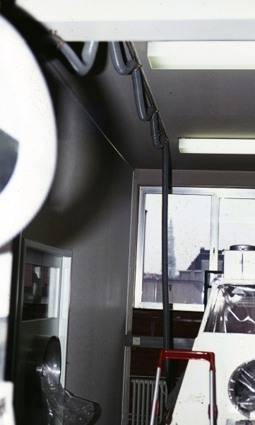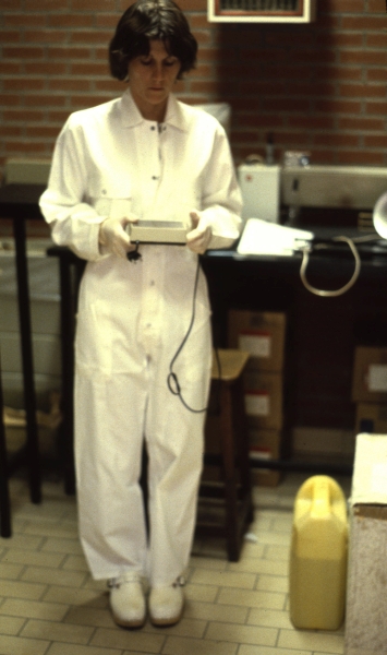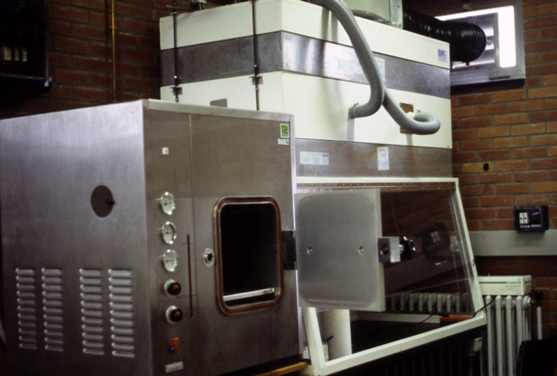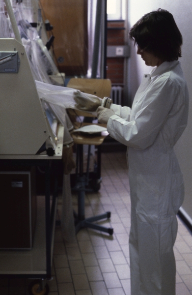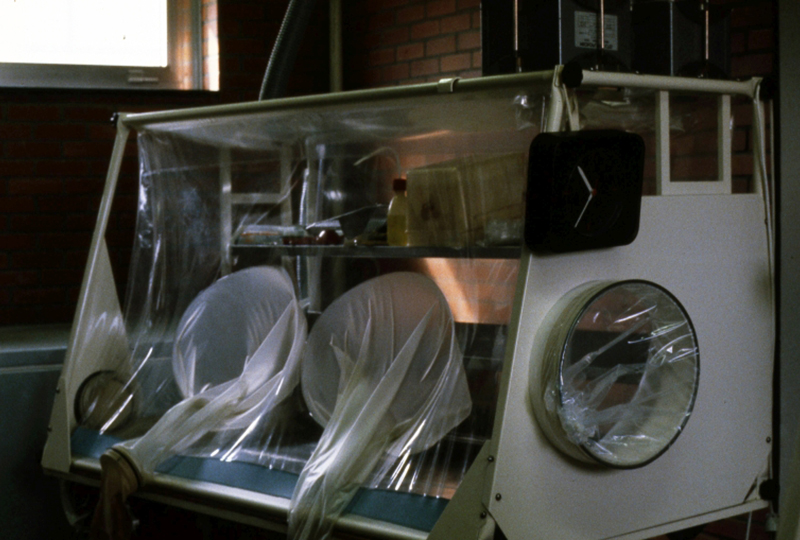 Working in a laminar flow cabinet, a partly open work space in which the air flows such that no dust particles, viruses or bacteria settle on the samples. At the same time the risks to the worker or researcher are limited. Maximum security laboratory, Antwerp, 1977.