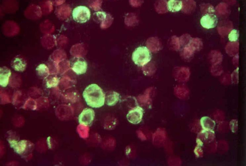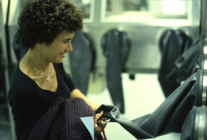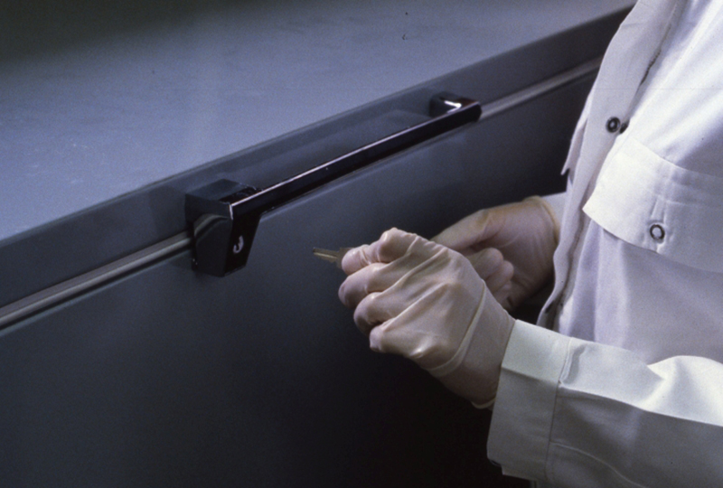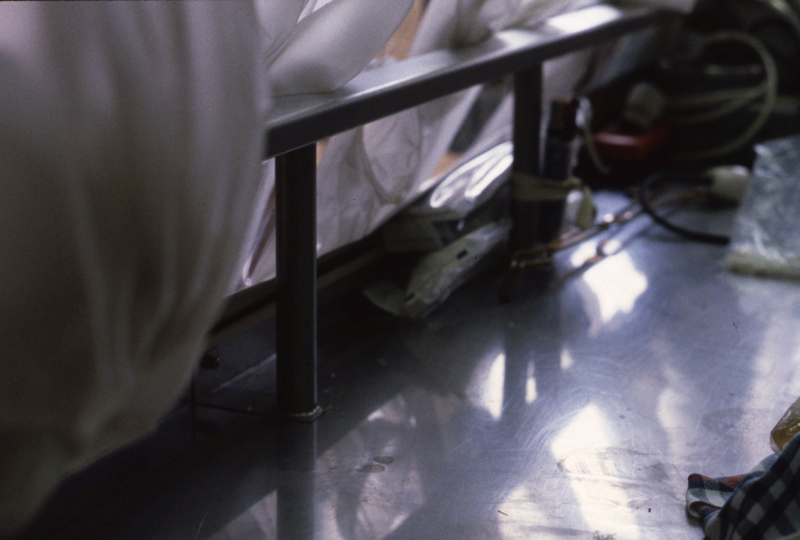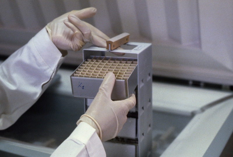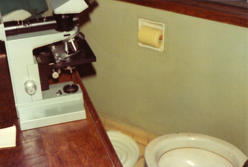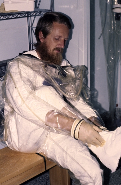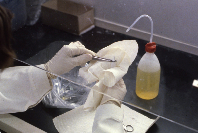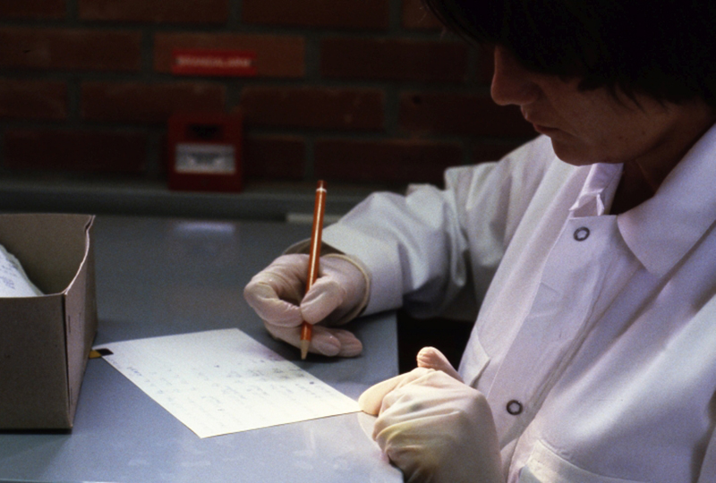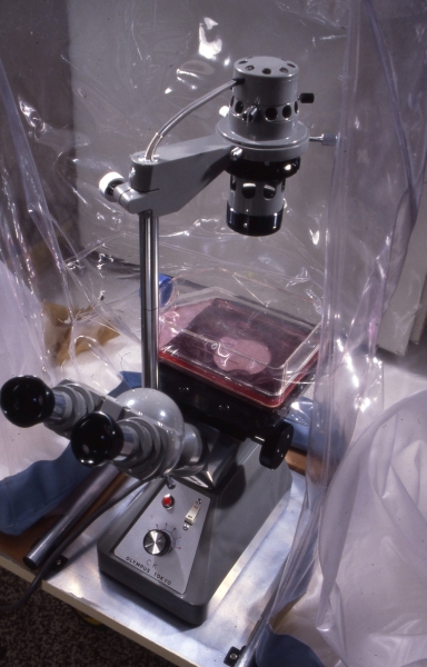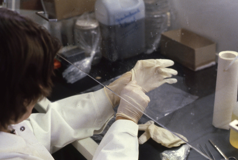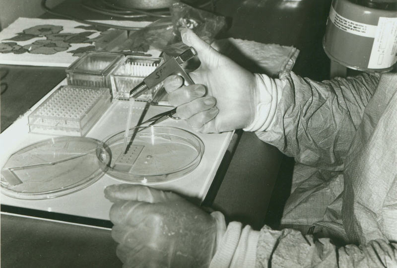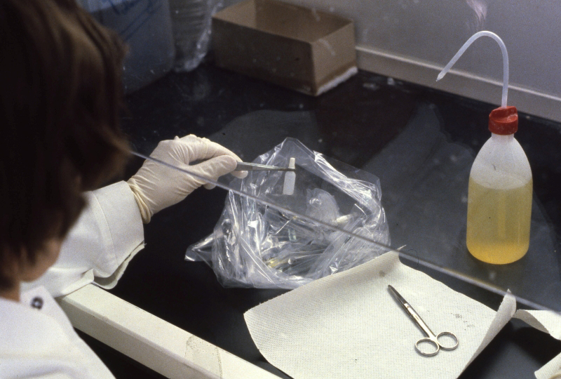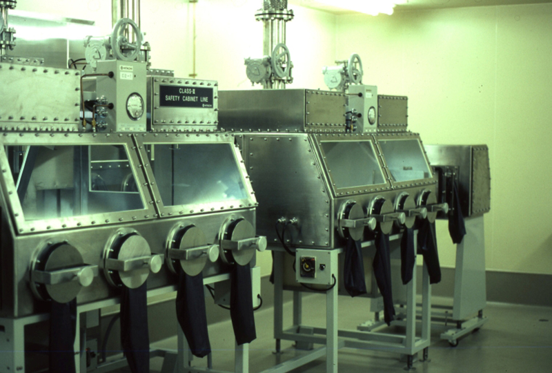 Working in a laminar flow cabinet, a partly open work space in which the air flows such that no dust particles, viruses or bacteria settle on the samples. At the same time the risks to the worker or researcher are limited. Maximum security laboratory, Antwerp, 1977.