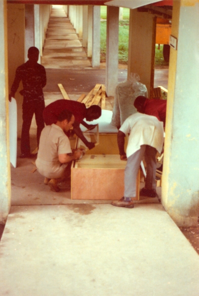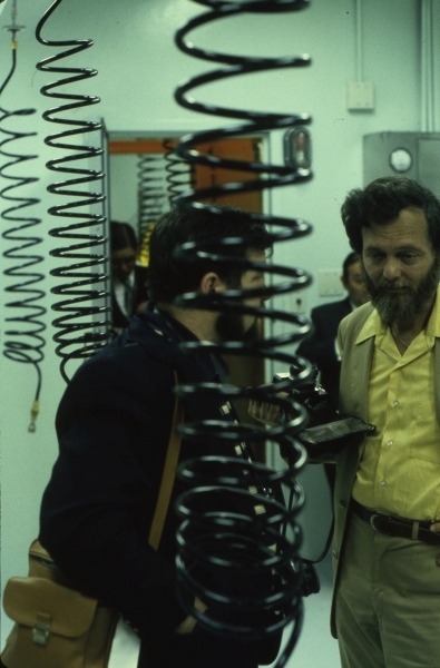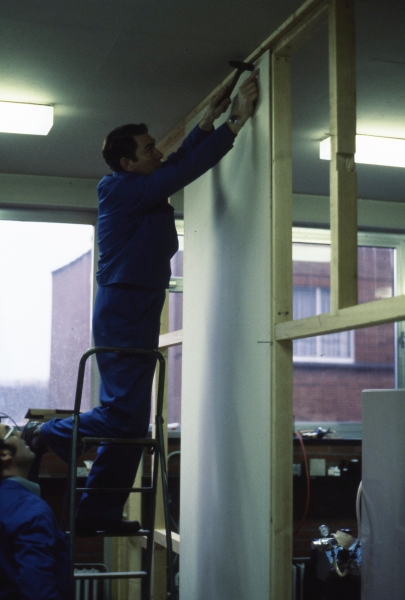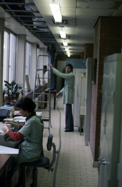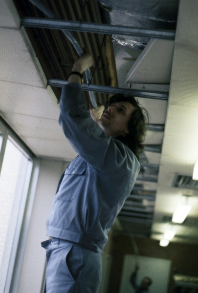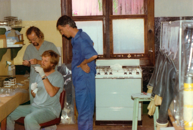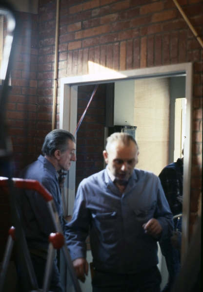 Workmen at the ITM. Marcel Debeuckelaer (electrician), Maurice in the background. Construction and commissioning of the maximum security laboratory. Antwerp, 1977.