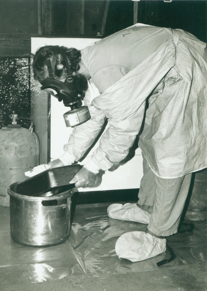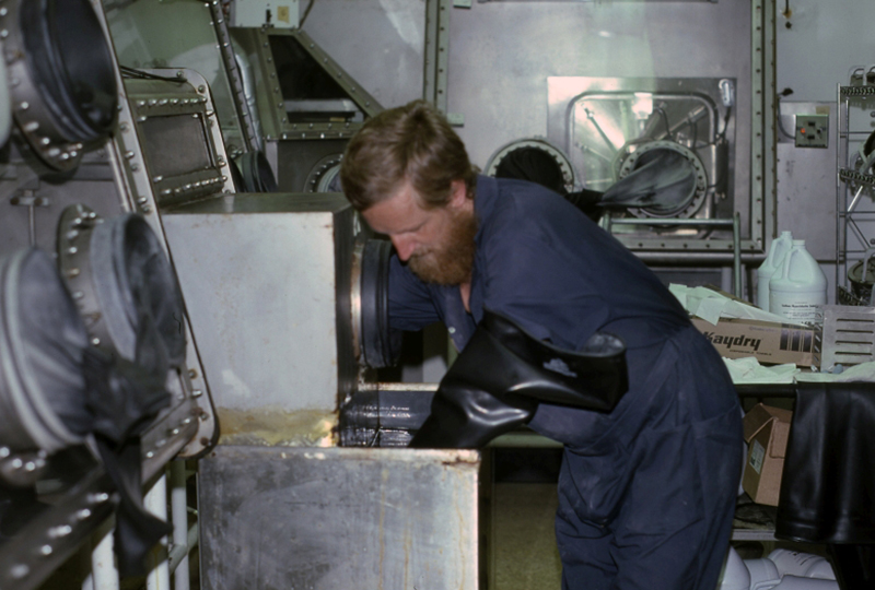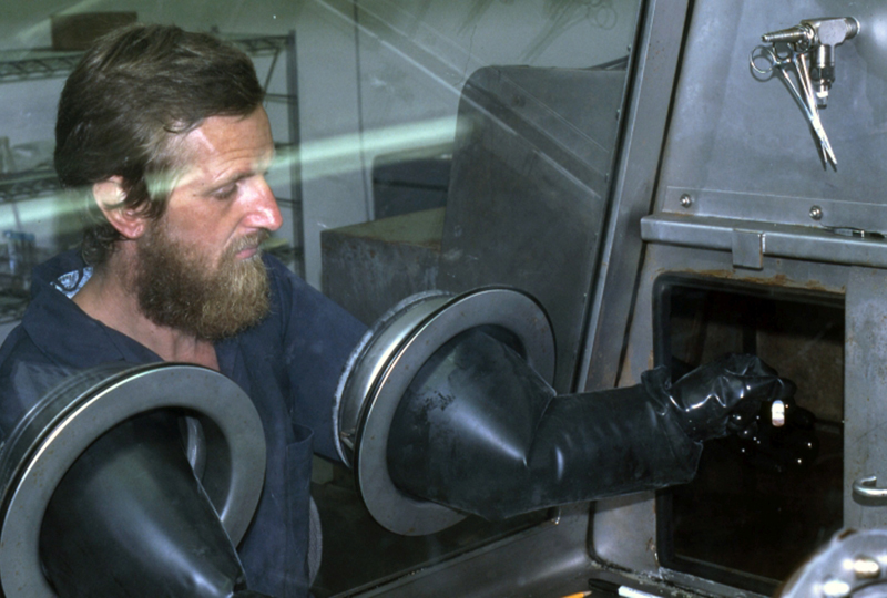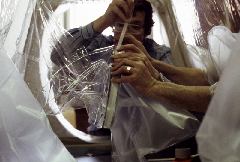 Greet Beelaert. sealing and melting the transportbag close during the removal of material from the isolator. Construction and commissioning of the maximum security labaratory. Antwerp 1977.