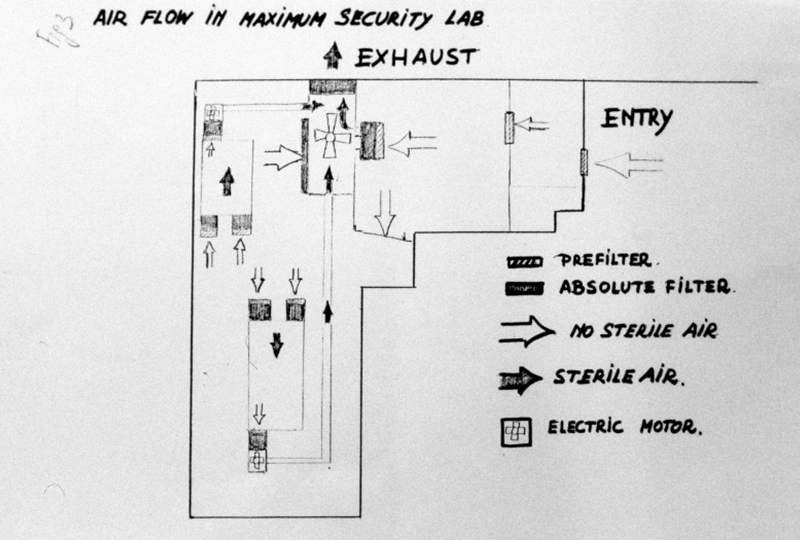 Sketch of the air circulation in the MSL, crucial for the safety of laboratory staff, the people in the rest of the building and city, and the scientific value of the samples and the investigation thereof. Maximum security laboratory. Antwerp, 1977.