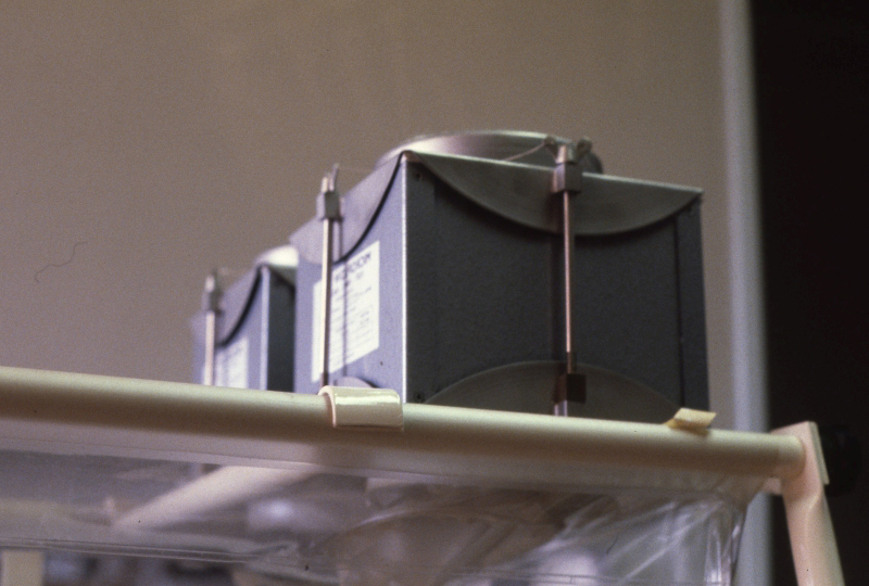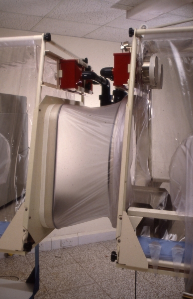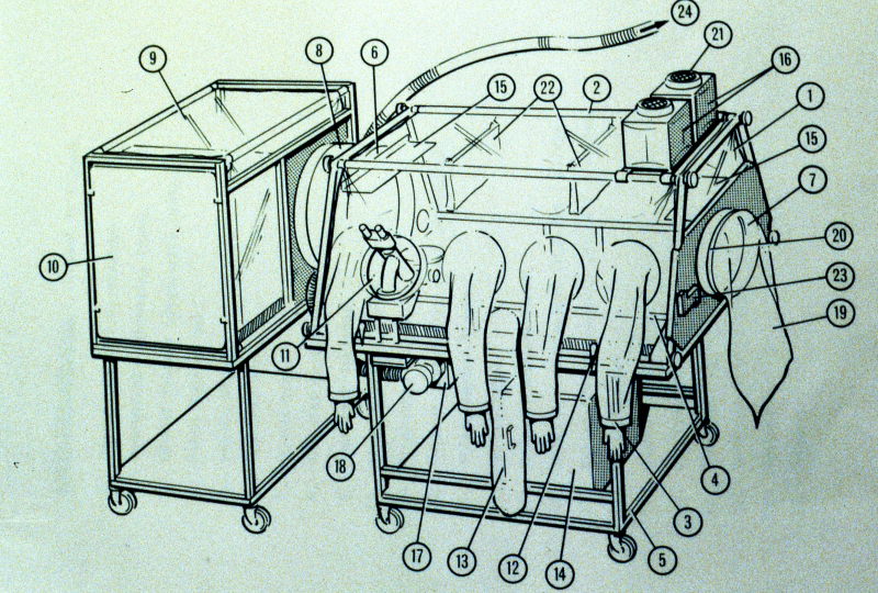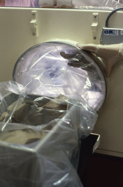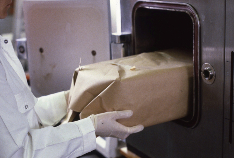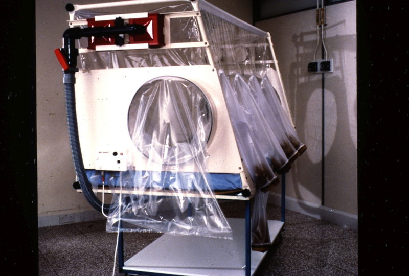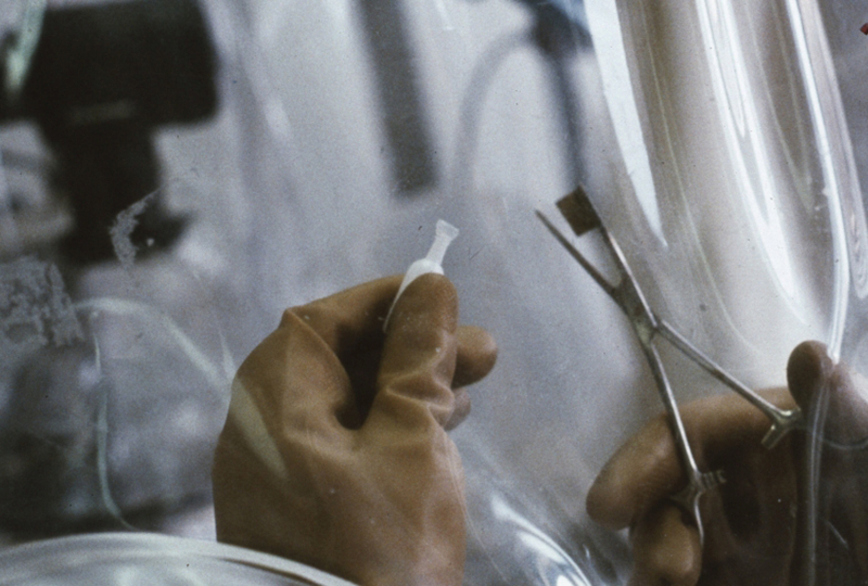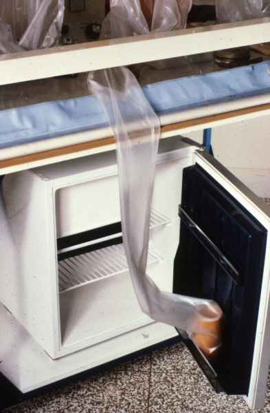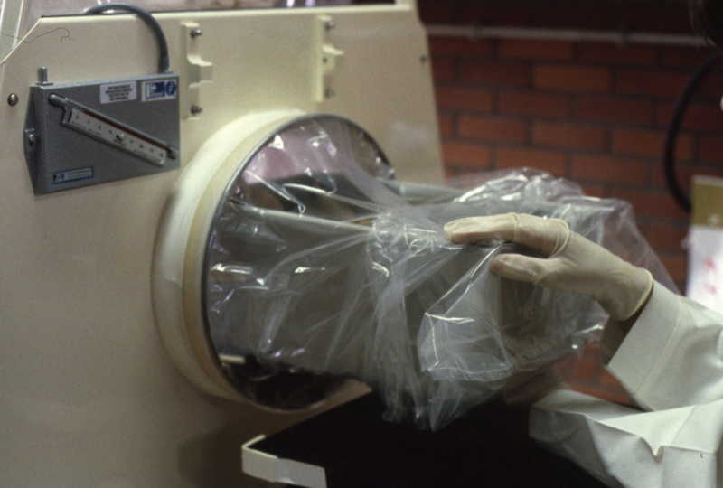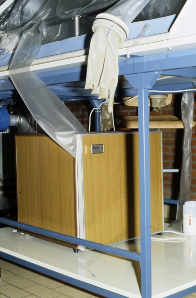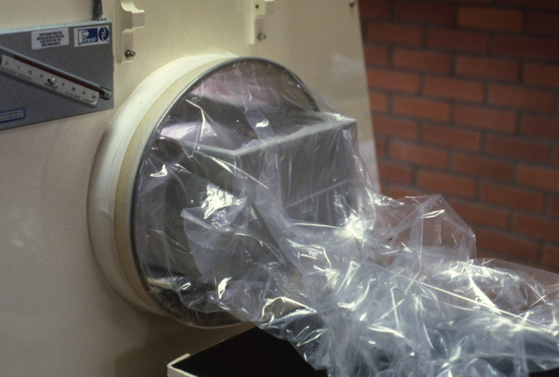 An object is removed from the isolator by placing it inside a plastic bag that has its mouth secured to the transfer port. As the object is pushed out through the port, the bag reverses to contain it. The end of the bag containing the object can then be melted closed using a bag sealer, and cut off. Maximum security laboratory, Antwerp, 1977.