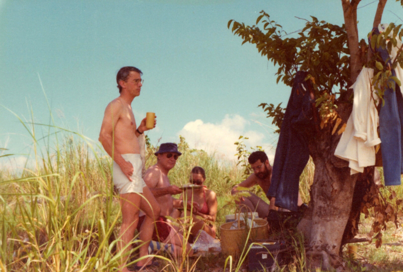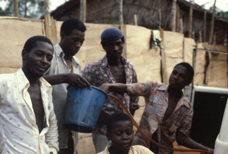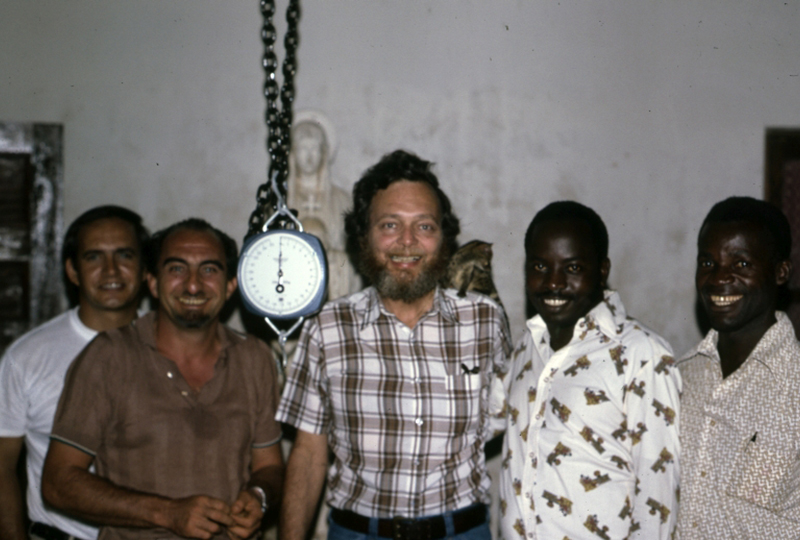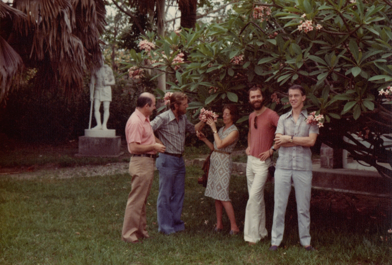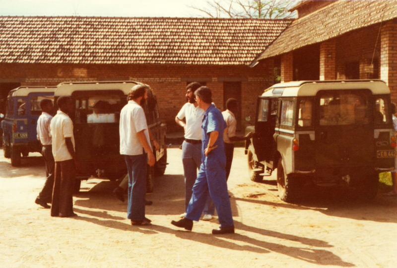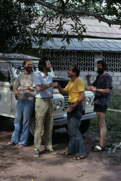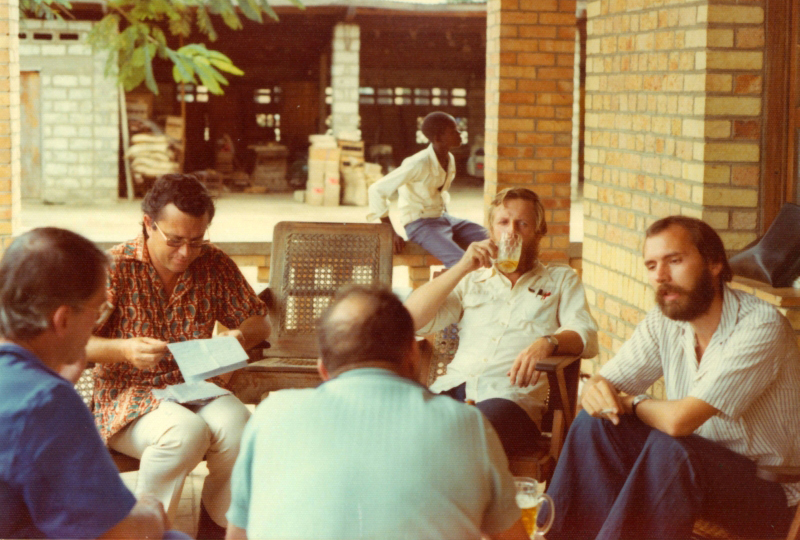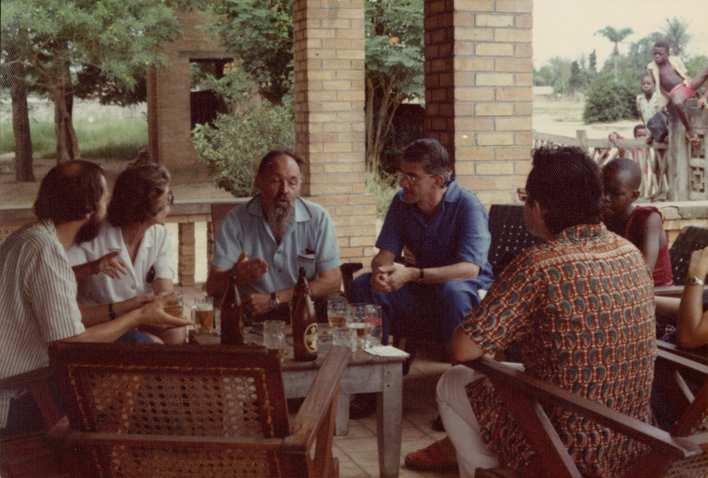 From left to right: Peter Piot, Margaretha Isaacson, Gust Seghers, Danny Courtois and Father Carlos at the mission of the last-named. Bumba, Zaïre, November 1976.