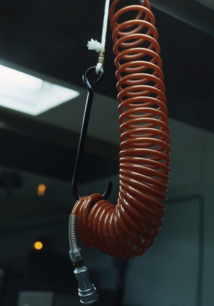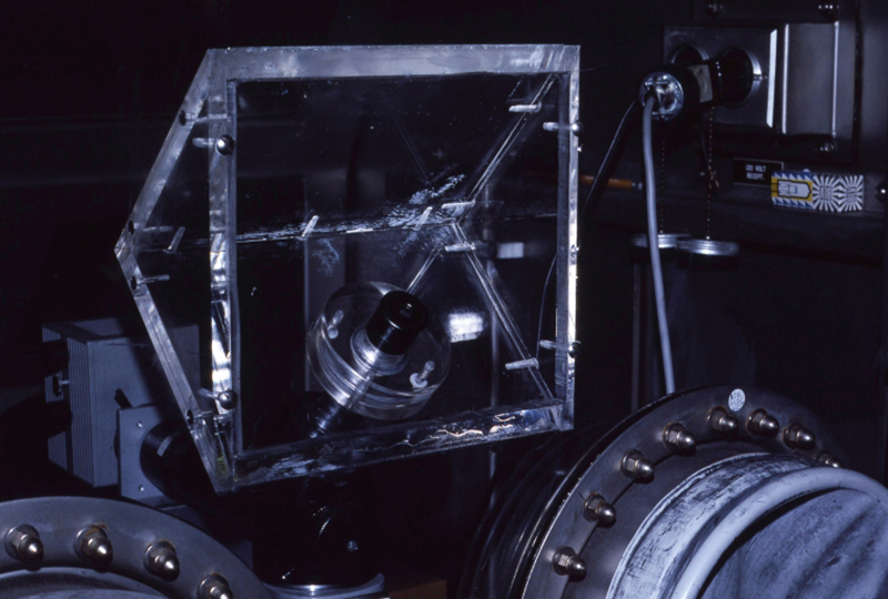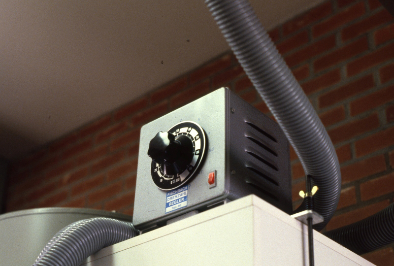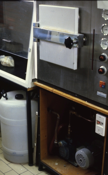 Low pressure control for the MSL’s isolators. As time passes the filters through which the exhaust air is sucked become dirtier and extra suction is required to maintain the low pressure . Maximum security laboratory. Antwerp, 1977.