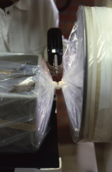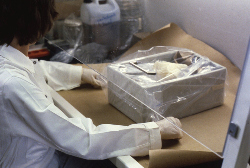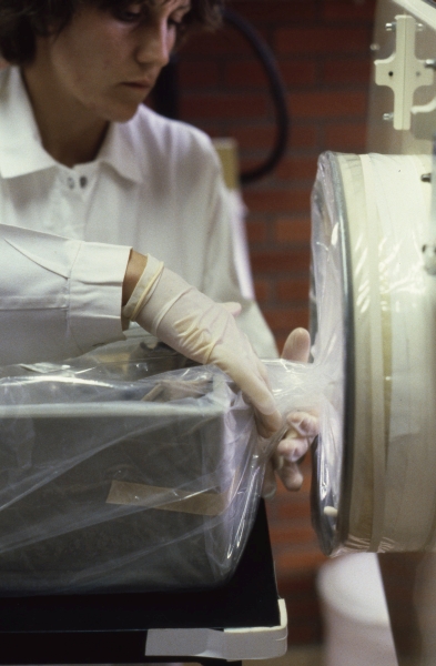 To place an object in the isolator the mouth of a new plastic bag containing it is stretched over the transfer port, making certain from the outside that the seal is airtight. The sealed end of the previous bag protrudes into the isolator. The new bag is then pushed into the isolator, within which the closed end of the previous bag is opened. The object is now inside the isolator, which has remained airtight throughout the procedure. Maximum security laboratory, Antwerp, 1977.