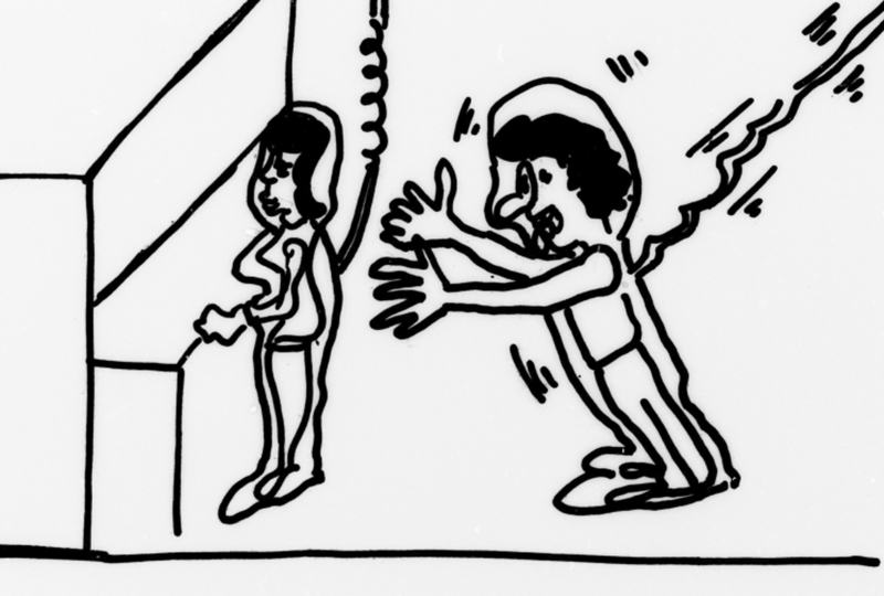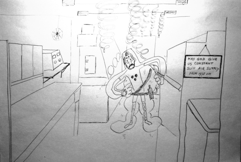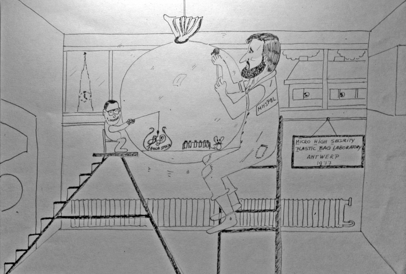 Cartoon drawn by Guido: a MSL is the best form of prevention against sexually transmitted diseases. Maximum security laboratory, Antwerp, 1977.