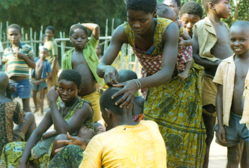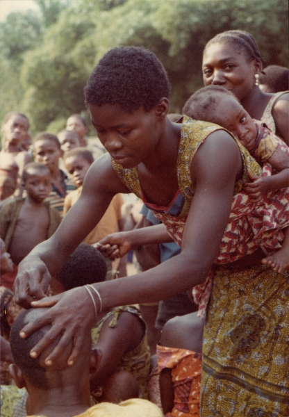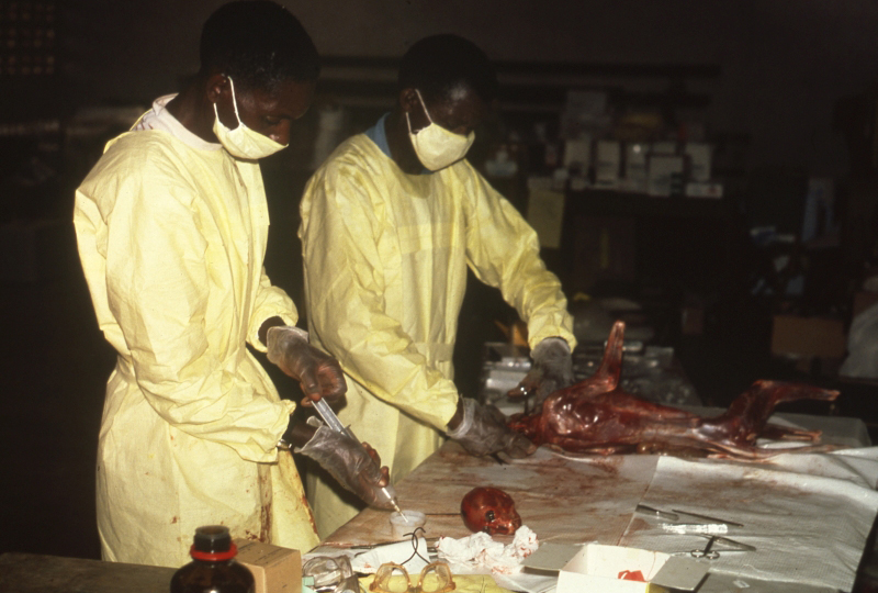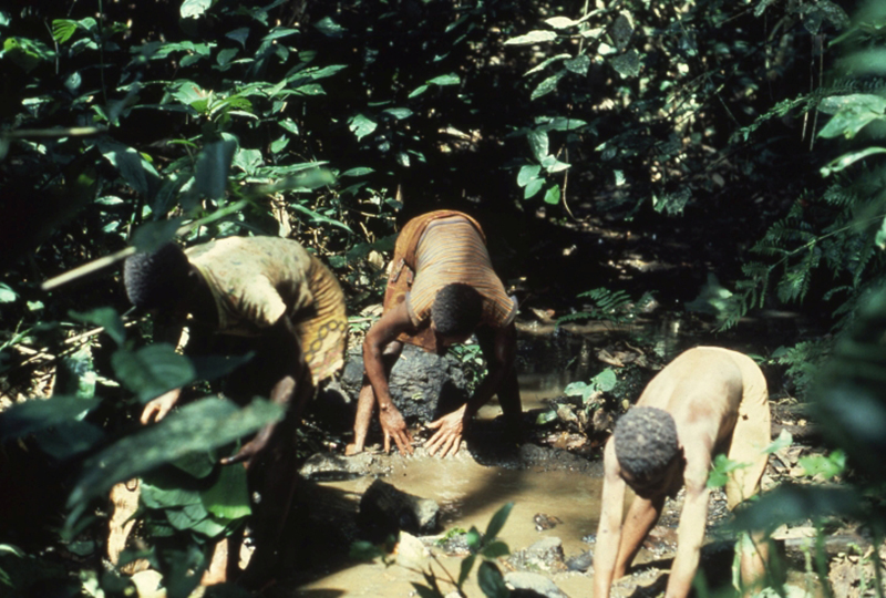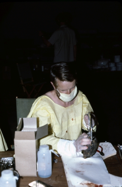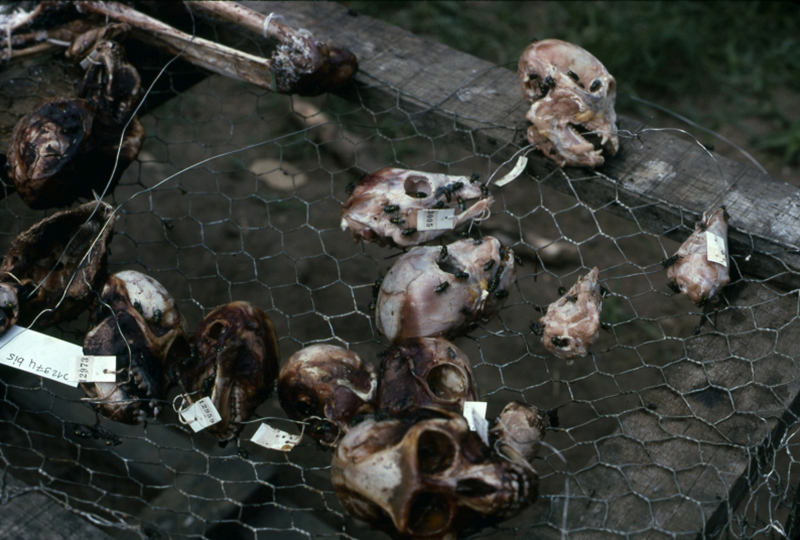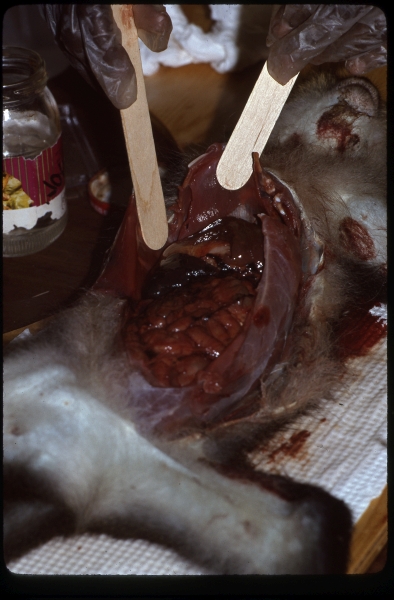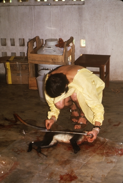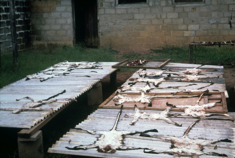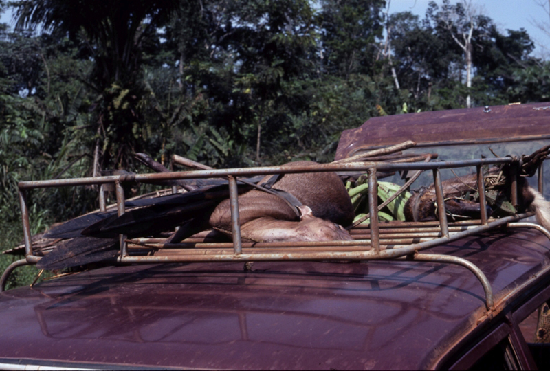 The animal’s intestines are intact. The hunters must hit the animals in the head or ribcage and not in the belly, otherwise the risk of bacterial contamination of the liver or lungs is too great to harvest usable samples. Tandala, Zaïre, 1979.