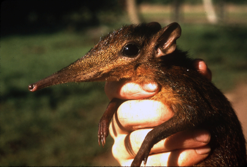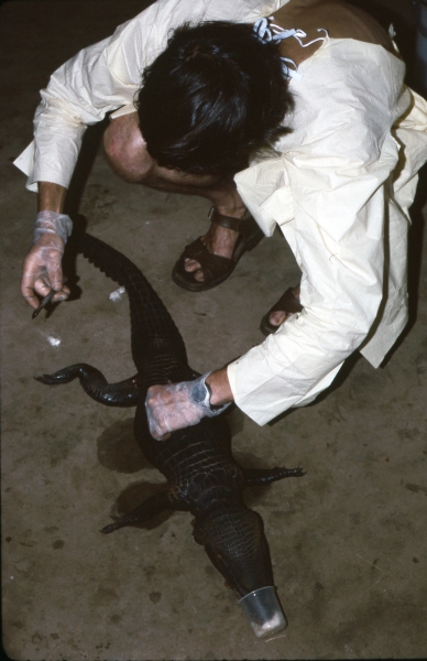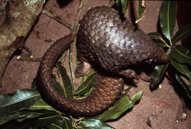 Due to its hard, horny scales that overlap like roof tiles, an African tree pangolin (Phataginus tricuspis - formerly Manis tricuspis) is not simple to dissect! Tandala, Zaïre, 1979.