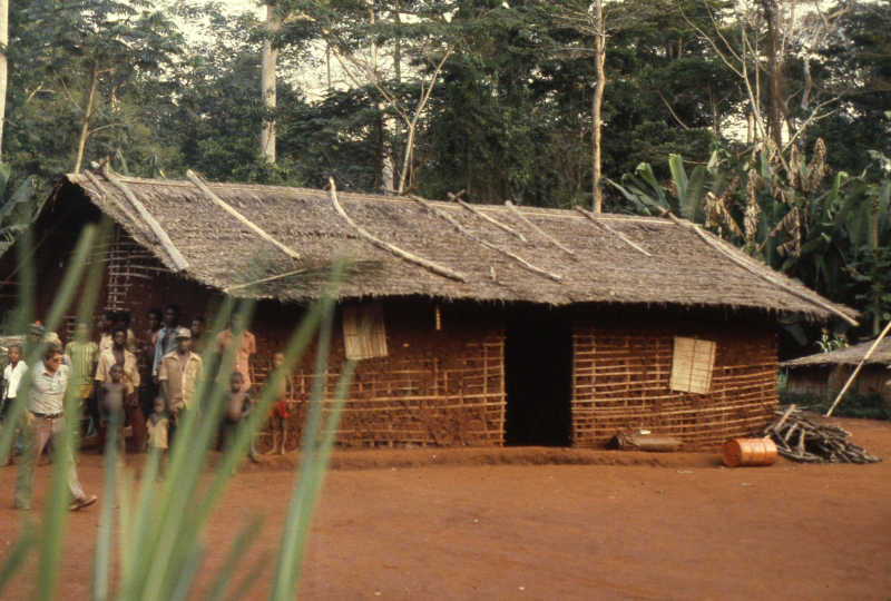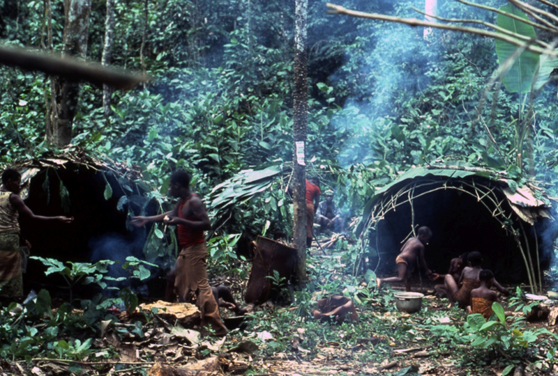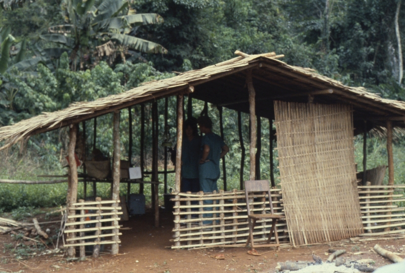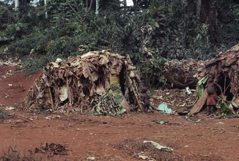 The luxury accommodation that the pygmies constructed especially for the expedition members in Mbatika. South-east Cameroon 1980.