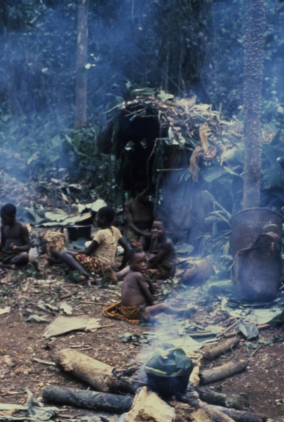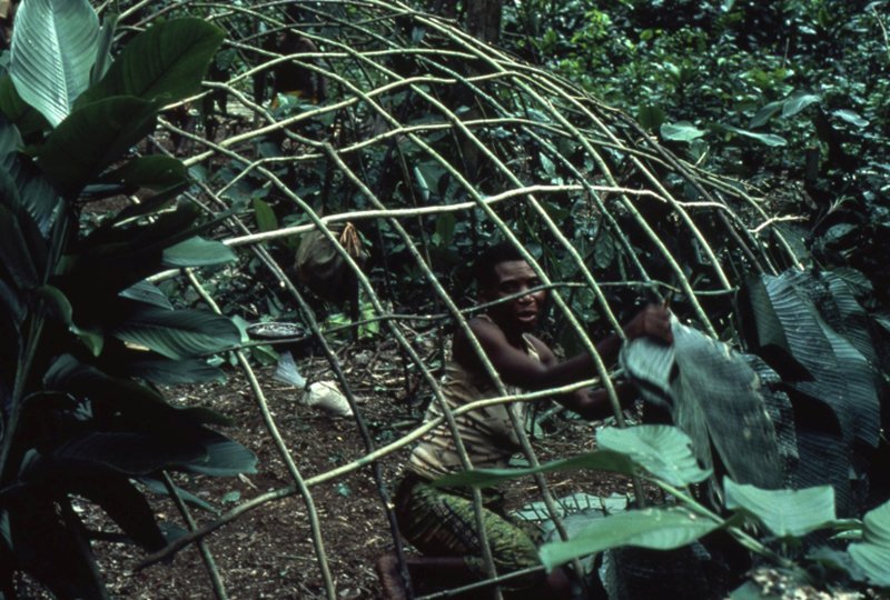 Construction of a banda or traditional pygmy hut in the heart of the jungle. South-east Cameroon 1980.